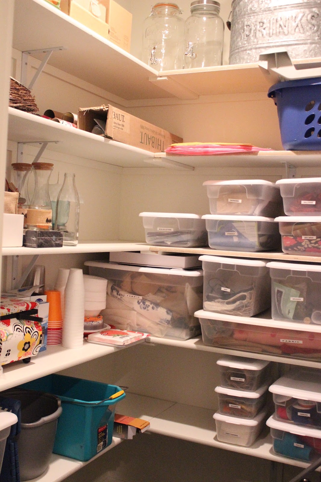One of the best decisions that I made while building our house was to make make our half bath a little smaller and instead create a "craft closet" in my laundry room. I do not know what I would do with all of this stuff if I didnt have this little space. I keep everything in here from craft items to beverage containers for hosting parties, to all of my glass vases, board games and cleaning buckets, all paper products like paltes, napkins, and silverware. The list really does go on and on. I have alot in here. With the hustle and bustle of Christmas this area took a beating. You could just close the door and no one had to know it was a mess. So I was really happy to get it straightened out and now it's much better.